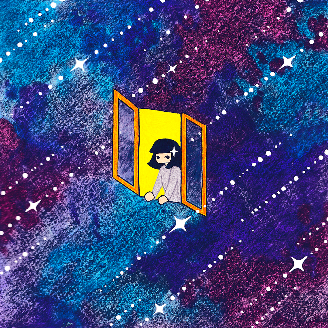 For the mixed media version, I have used watercolour for the galaxy themed background, gouache for the flat colour layer of the girl and the window and on top of everything I have added details and the darkness of the space with coloured pencils. Lastly, I have painted the stars with white gouache in order to create more contrast. This version is not my favourite one, however it is a good start.