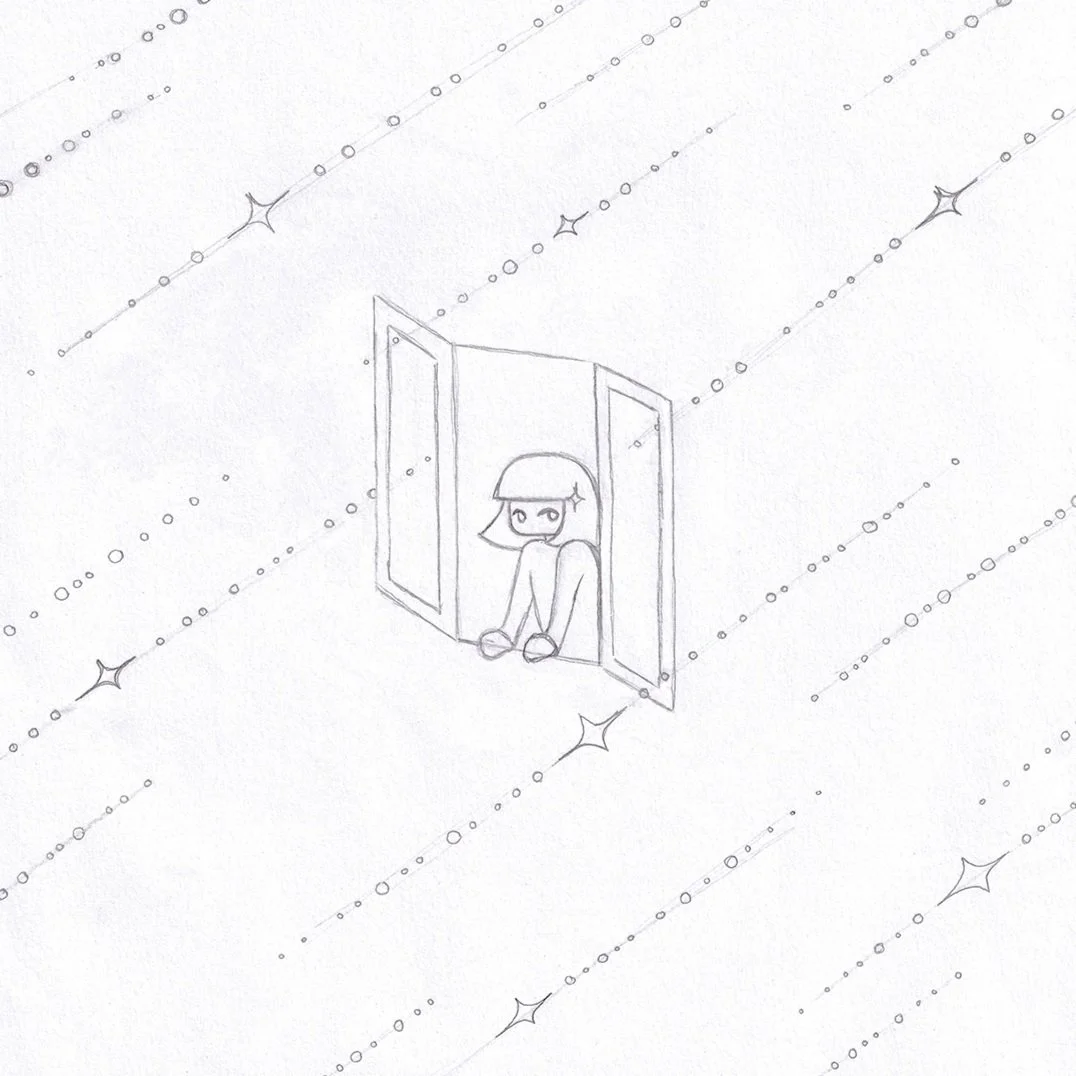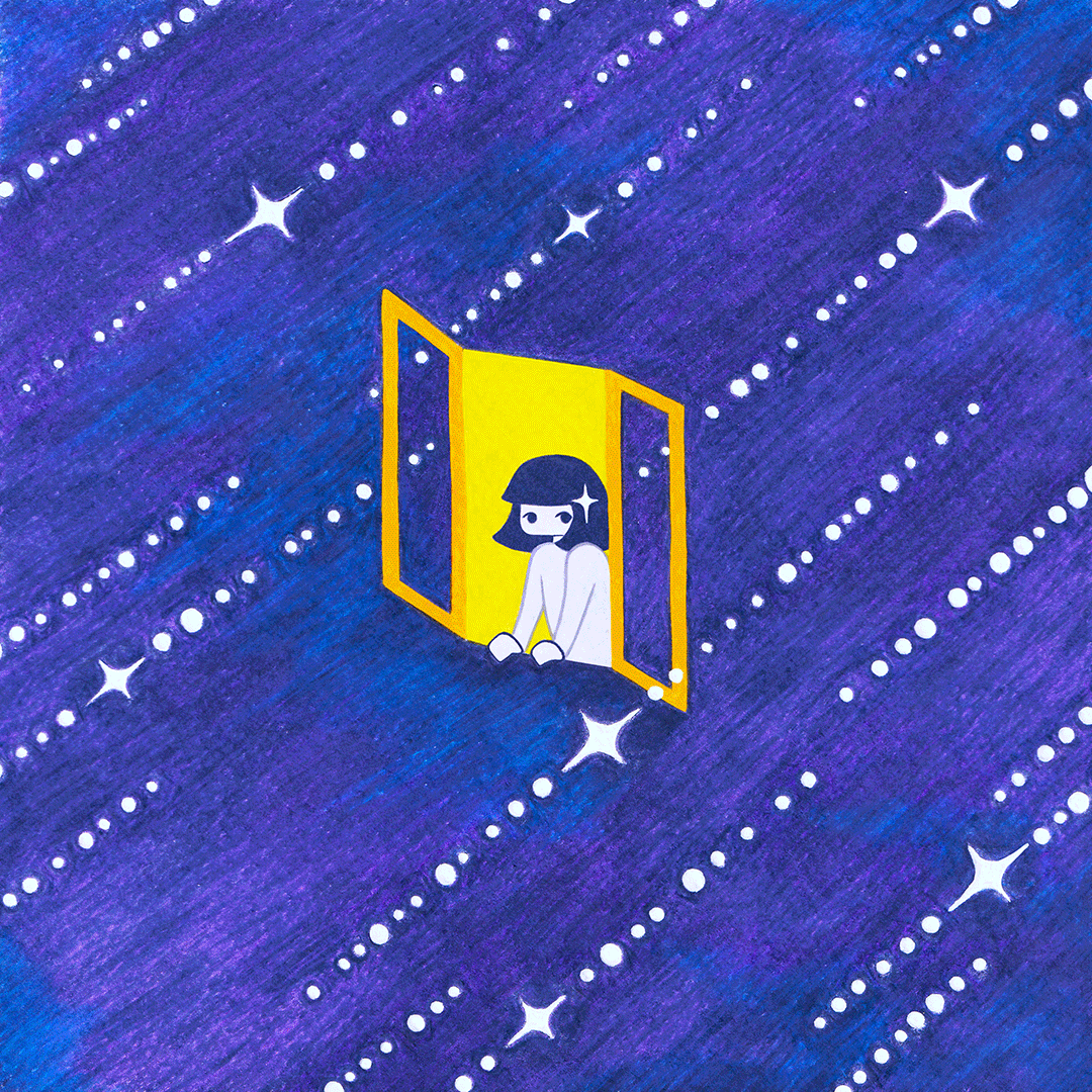 The first version of this illustration was created with coloured pencils only. First came the pink, purple and blue nuances in the background to give the cosmical feel, over which a indigo layer was added to bring everything together. The window of the girl was kept a bright yellow to show the warm lighting coming from the earthly world, in contrast to the outer space. Lastly, but not the least, the shooting stars were kept as a white space and drawn around them, in order to keep them as visible as possible.